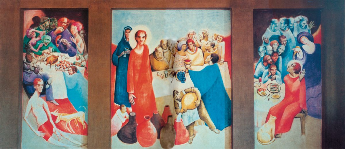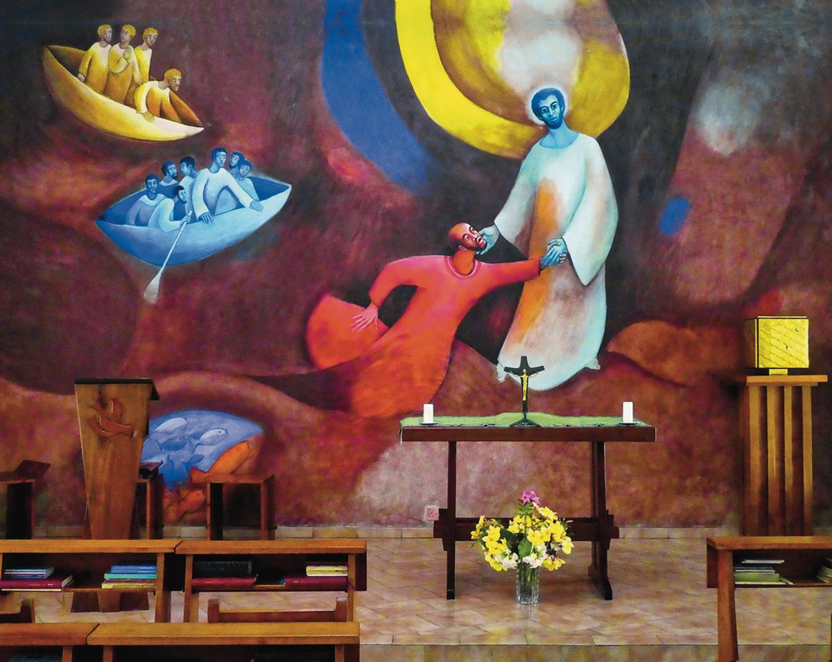 Als Polykarp 1963 in die Benediktinerabtei Ndanda ausgesandt wurde, erwartete man ihn bereits. Nicht als Englischlehrer, sondern als Künstler. Zunächst illustrierte er in der Abtei im Süden Tansanias christliche Schulbücher, doch bald bat man ihn, die allerorten neu entstehenden Kirchen auszumalen. „Mtwara war meine erste große Kirche“, erinnert er sich. Die Hafenstadt am Indischen Ozean ist die Hauptstadt eines Distrikts an der Grenze zu Mosambik. Vier Jahre habe dieses erste Großprojekt in Anspruch genommen. Probleme mit dem Riesen-Format hatte er nie: „Das ging wie von selbst!“