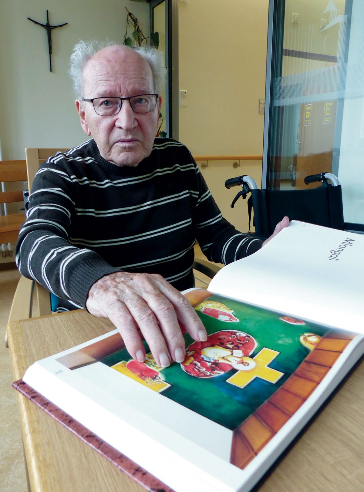 Seit Juli 2019 ist Pater Polykarp Uehlein wieder zurück in der Abtei. Nach einer schweren Erkrankung lebt er im klostereigenen Senioren- und Pflegeheim. Zwar kann er jetzt wieder kurze Stücke am Rollator gehen, der Weg ins Atelier ist jedoch zu beschwerlich. In seinem Zimmer zeichnet er dafür unermüdlich weiter.