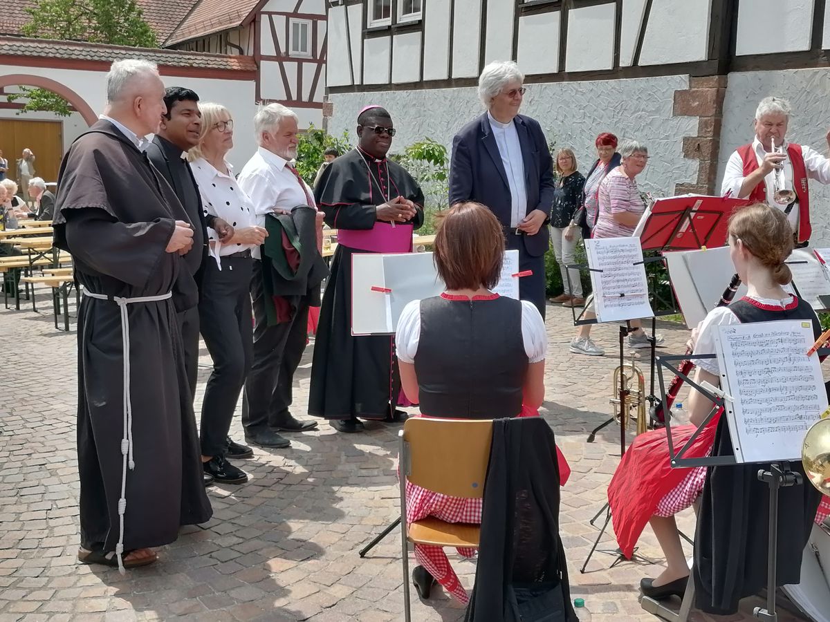 Weiter bemerkte der Bischof: „Es ist unglaublich, was die Menschen hier für uns tun. Eine gemeinsame Messe ist eine ausgezeichnete Gelegenheit, ‚danke‘ zu sagen.“ 15 Musikerinnen und Musiker des Böttigheimer Blasmusikensembles, der Chor „Liederkrone“ aus Neubrunn und eine Gesangssolistin sorgten für einen festlichen Gottesdienst. Das lokale Engagement traf auf weltkirchliche Weite: Pater Jerry Matthäus aus Indien leitete die Messe, unterstützt von Bischof Kasonde und dem Würzburger Franziskanerpater Gerhard Wenzel, der selbst jahrelang engagierter Seelsorger in Afrika war. Nach dem Gottesdienst feierten rund 100 Böttigheimerinnen und Böttigheimer mit dem Bischof bei Blasmusik, Spei-sen und Getränken auf dem Marktplatz weiter. Später fuhren Mitglieder des S.A.m.b.i.A.-Vereins mit Kasonde nach Würzburg.
