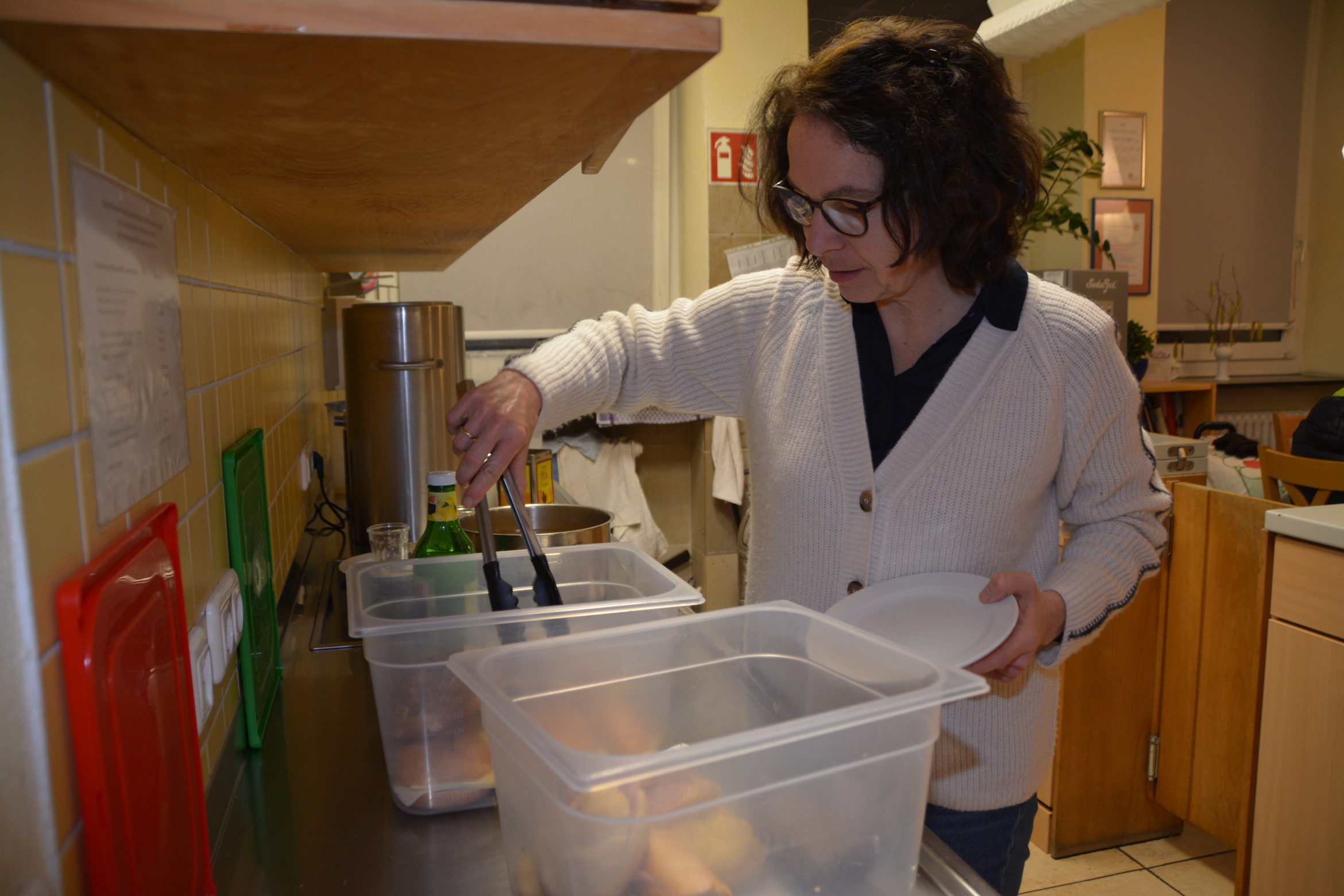 Unter anderem bei Petra Elflein. Hinter der Theke ist immer etwas zu tun: Essen und Getränke ausgeben, die Spülmaschine ein- oder ausräumen, Geräte laden oder auch mal eine Brille saubermachen. Die Gymnasiallehrerin engagiert sich seit 2013 ehrenamtlich in der Bahnhofsmission. Sie hört gut und gerne zu: „Was mich überrascht, ist, dass die Leute hier ohne Filter mit dir reden“, sagt Elflein. Außerhalb ihres Ehrenamts erlebe sie viel Zurückhaltung in der Kommunikation. In der Bahnhofsmission ist das anders: „Ich komme aus meinem Reihenhaus in eine andere Welt. Eine Welt, in der die Leute einfach sein dürfen, wie sie sind.“