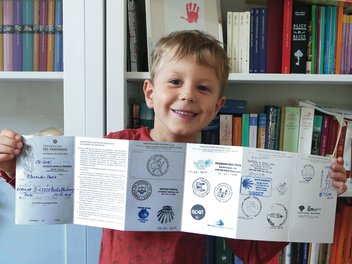 Gestartet sind die beiden dann in der Stadt Porto in Portugal auf dem sogenannten „kleinen Camino“. Der Weg verläuft dort relativ eben und ist deshalb für einen Vierjährigen ganz gut zu bewältigen. Zehn bis zwölf Kilometer waren sie täglich auf Schusters Rappen unterwegs, auch wenn das Gespann zwischendurch die eine oder andere Pause einlegen musste. So waren sie immer ganz gemütliche fünf bis sechs Stunden unterwegs. Nach der Ankunft am Etappenziel verblieb dann auch immer noch genügend Zeit, sich den jeweiligen Ort anzusehen oder am Strand zu spielen. „Am ersten Tag im Meer baden“, sagt Alexander auch ohne zu überlegen, wenn man ihn fragt, was denn am schönsten war. Er habe tapfer durchgehalten und nie Blasen an den Füßen gehabt, berichtet er stolz. Aber er gibt schon zu, dass er manchmal ein bisschen gejammert habe. Dann war als letztes Mittel die Bitte an die Mama: „Ich möchte auf den Arm.” Auf die Frage, was man denn so alles mitnehmen müsse, sagt er: „Einen Rucksack und ganz viel zu trinken, aber mehr braucht man eigentlich nicht.” Das reicht aber nur, wenn man eine Mama dabei hat, die in ihrem Rucksack die Kleider, den Proviant und was man sonst noch so braucht, gepackt hat und die einen zur Not auch mal ein Stückchen trägt.