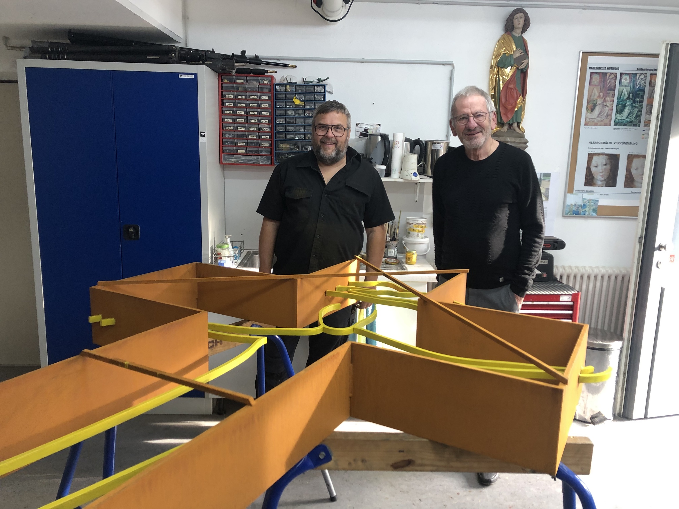 Bei einem Ortstermin in Randersacker präsentierte Hofmann das monumentale Flurkreuz, allerdings noch ohne Vergoldung. Dieser Arbeitsschritt werde noch folgen, kündigte Lenssen an, als er das sechste von ihm entworfene Flurkreuz präsentierte. Danach ging es mit Ralf Kuhn vom Bauhof der Gemeinde Randersacker weiter zu dem künftigen Standort hoch über dem Maintal mit weiter Aussicht auf die Flusslandschaft. Noch war einiges zu erledigen. Aber Dr. Lenssen zeigte sich zuversichtlich: Die Einweihung werde wie geplant am 14. September um 17 Uhr im Rahmen einer Andacht zum Fest Kreuzerhöhung stattfinden.