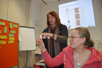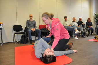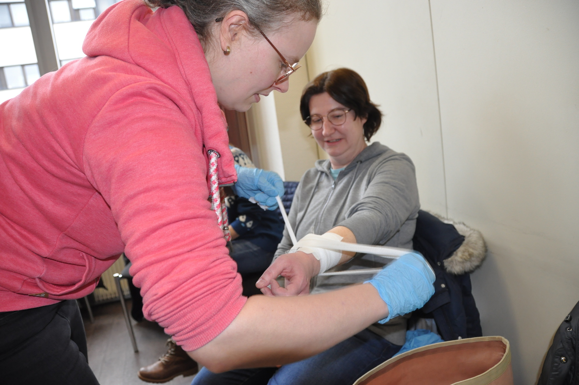 Zum Erste-Hilfe-Kurs bei den Maltesern ist Katharina Leniger mit ihrer Kollegin Silke Beetz gekommen, die ebenfalls im Referat Geistliches Leben arbeitet. Sie frischt regelmäßig alle zwei Jahre ihr Wissen auf. „Ich bin froh, dass auch der Arbeitgeber mit drauf schaut und die Ersthelfer-Ausbildung fördert“, sagt Silke Beetz. Mit im Kurs sitzen Mitarbeiterinnen und Mitarbeiter des Bildungshauses Himmelspforten, darunter Küchenleiter Gerald Pfennig. „Bei unserem festen Personal passiert weniger, aber es kommt schon mal vor, dass sich ein Praktikant schneidet“, fasst er seine Erfahrungen in Erster Hilfe zusammen. Das Personal fühle sich auch den Gästen des Bildungshauses verpflichtet: „Das sind oft Kleinigkeiten, etwa wenn ein Gast stolpert oder sich heißes Essen über die Kleidung kippt.“